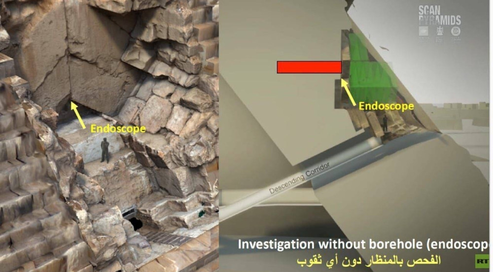 وأردف أن الفريق البحثي قام بالمسح بتقنية الموجات فوق الصوتية UST لاختبار منطقة الجمالون في هرم خوفو، وأكدت التقنية وجود انعكاسات متسقة مع التقنيات الأخرى، إلى جانب دمج صور القياسات وتحليل جميع عمليات مسح الخطوط في الأبعاد الثنائية والثلاثية، مما أدى إلى تحديد حدود الفراغ وشكله ومكانه بدقة عالية تصل إلى سنتيمترات قليلة.