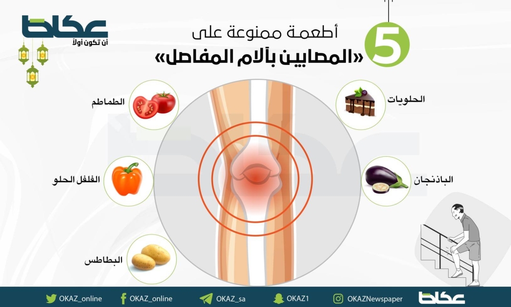 نصحت خبيرة التغذية الروسية الدكتورة أنجيليكا دوفال، كل من يعاني من مشكلات في المفاصل بالامتناع عن تناول بعض الأطعمة، لاسيما من يعاني آلام المفاصل سواء كان تورماً أو شعوراً بألم عند لمس واحد أو أكثر من مفاصل الجسم، وقالت «الأشخاص الذين يفرطون في تناول الكربوهيدرات البسيطة، والسكر المكرر، والمعجنات والحلويات، والأطعمة المعالجة، هم أكثر عرضة للإصابة بالتهابات مختلفة، بما فيها التهاب المفاصل».
