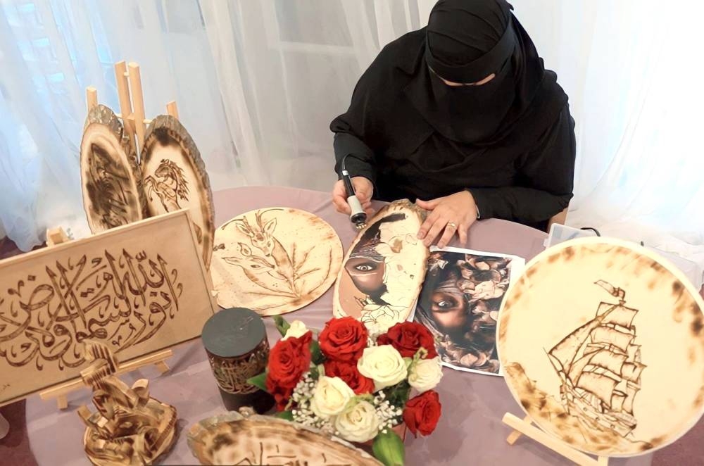 فاطمة الرويلي إحدى موهوبات فن الرسم بالحرق على الخشب.