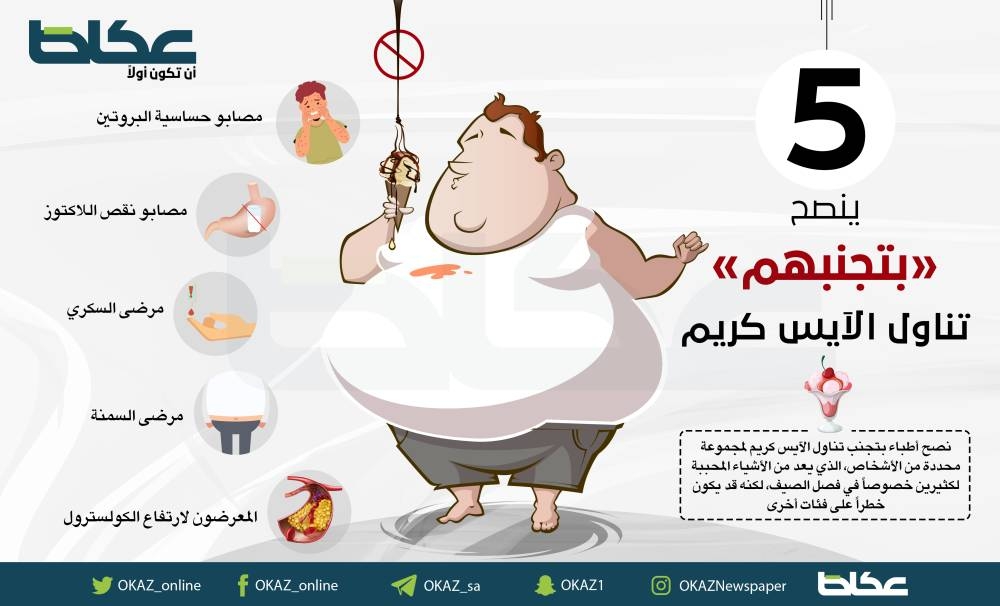 نصح أطباء بتجنب تناول الآيس كريم لمجموعة محددة من الأشخاص، الذي يعد من الأشياء المحببة لكثيرين خصوصاً في فصل الصيف، لكنه قد يكون خطراً على فئات أخرى، ونصحت الدكتورة تاتيانا نيمالتسيفا الأشخاص الذين يعانون من الحساسية لبروتين الحليب بعدم تناول الآيس كريم (البوظة)، والأشخاص الذين يعانون من نقص اللاكتوز بالحد من تناوله، وفق روسيا اليوم.