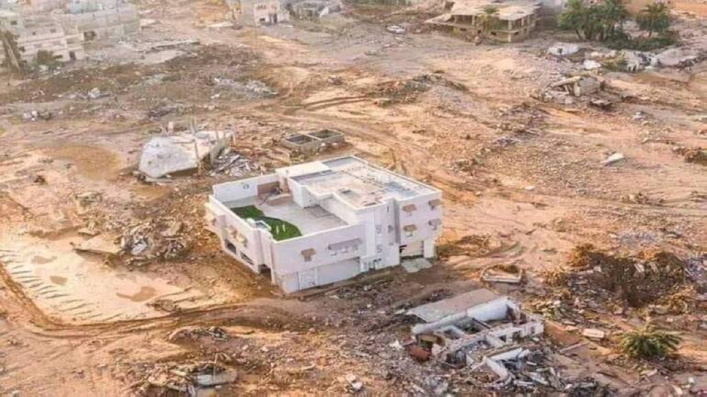 تداول رواد مواقع السوشل ميديا مجموعة صور ومقاطع فيديو لمنزل بقي صامداً وسط مدينة درنة الليبية، رغم الفيضانات التي اجتاحت المدينة منذ أيام ودمرتها تماماً، مخلفة آلاف القتلى والمفقودين والمشردين.