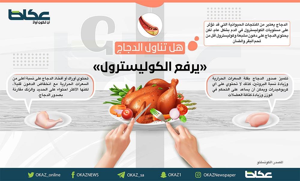يمكن أن يكون تناول الدجاج جيداً لمرضى الكوليسترول إذا تم تناوله بشكل صحيح، بحيث يقدم مسلوقاً أو مشوياً ودون جلد.