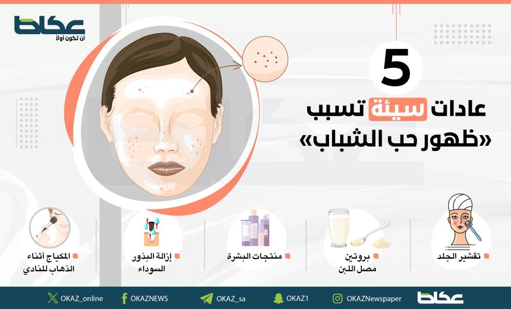 حددت خبيرة العناية بالبشرة ناتالي أونيل، بعض العادات الخاطئة والسيئة التي قد تتسبب بنشوء حب الشباب، ونصحت بعدم تقشير الجلد إذا كانت البشرة حساسة، لأن التقشير عملية تحفز نشوء حب الشباب والبثور فيها.، وفي ما يلي 5 عادات سيئة تسبب ظهور حب الشباب، وفق صحيفة ديلي ميل البريطانية: