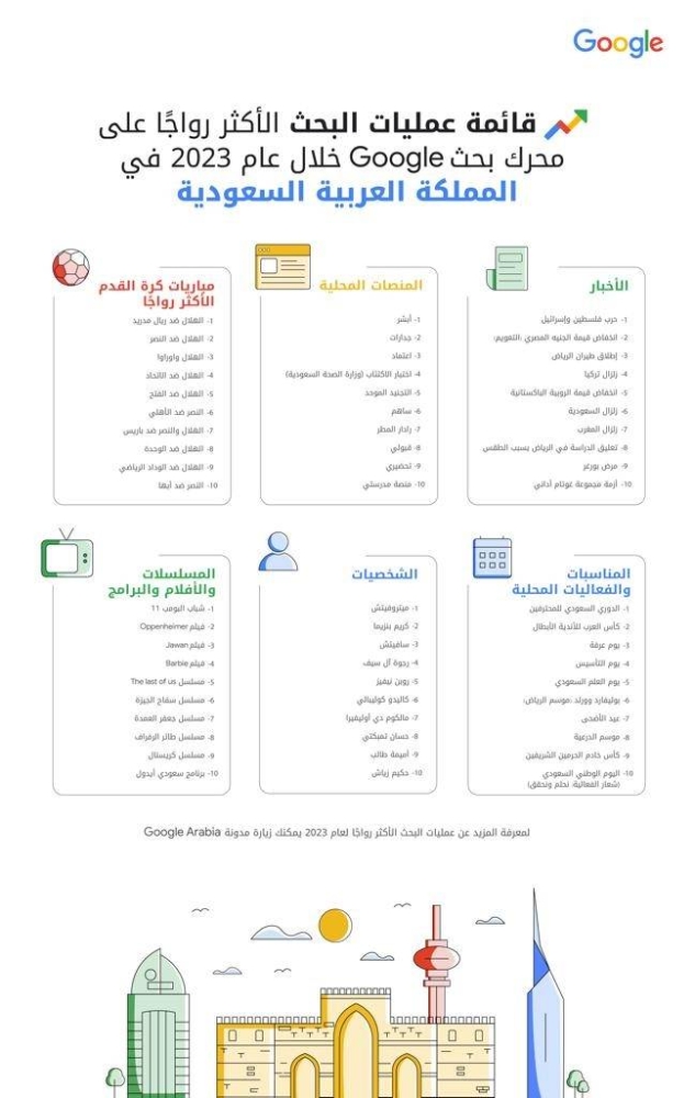 يذكر أن «قوقل» أطلقت اليوم قوائم المواضيع الأكثر بحثًا لعام 2023 في منطقة الشرق الأوسط وشمال أفريقيا. وتكشف القوائم السنوية كلمات البحث التي حققت نموًا ملموسًا خلال العام مقارنةً بالعام السابق. وتضم القوائم مواضيع مختلفة مثل الأخبار، والمنصات، والفعاليات، والأفلام، والمسلسلات، والمباريات الرياضية، والشخصيات التي بحث عنها الأفراد في مختلف الدول.