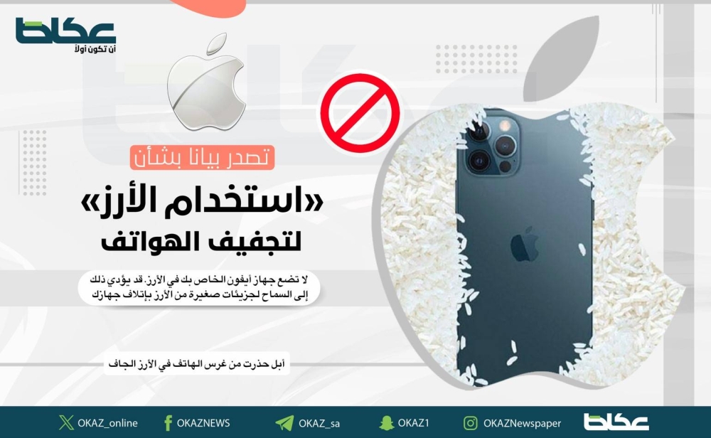 لكن في تعليمات جديدة، قالت «أبل»: «لا تضع جهاز أيفون الخاص بك في الأرز. قد يؤدي ذلك إلى السماح لجزيئات صغيرة من الأرز بإتلاف جهازك».