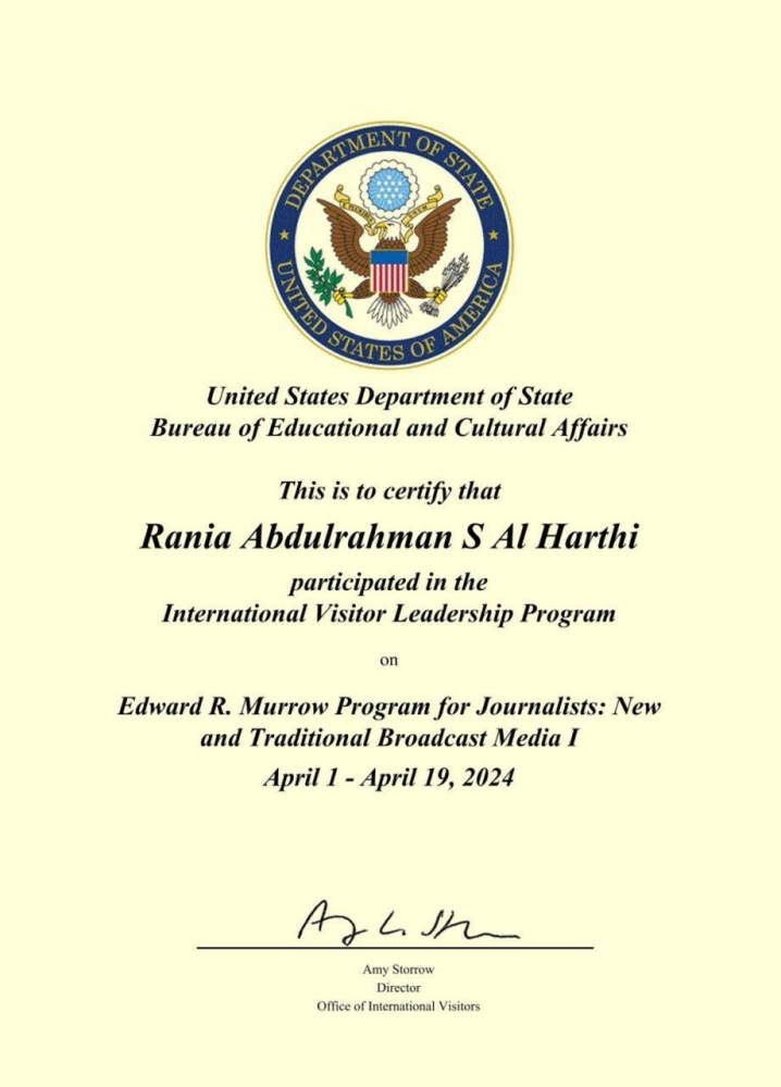 حصلت الزميلتان سمر الحارثي ورانيا الحارثي، على شهادتي التخرج من برنامج Edward-R Murrow للصحفيين، الذي تقدمه وزارة الخارجية الأمريكية، ضمن برنامج التبادل الثقافي والمهني لبرنامج الزائر الدولي القيادي (IVLP).
