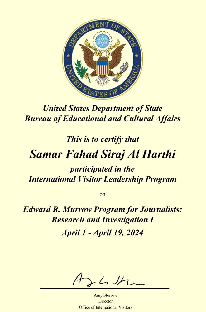 وأكملت مدير مكتب رئيس التحرير سمر الحارثي، متطلبات التخرج في البرنامج بعنوان البحث والتقصي (الصحافة الاستقصائية)، والذي أدارته بالتعاون مع الوزارة منظمة world learning، والذي تضمن نظرة على أهمية وتاريخ الصحافة الأمريكية، والحقوق والمسؤوليات على الصحفي الاستقصائي في الولايات المتحدة.