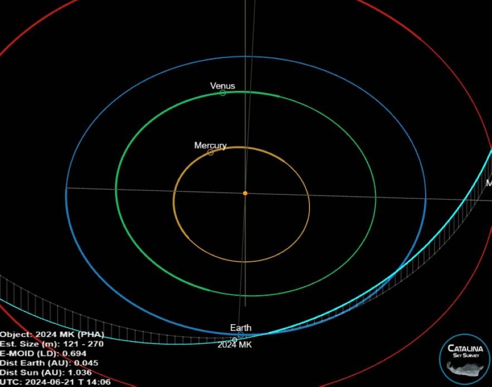 أعلن مركز الفلك الدولي، أن كوكب الأرض سيشهد يوم السبت القادم 29 يونيو 2024، مرور الكويكب «2024 MK» على مقربة كبيرة من الأرض، وذلك في الساعة 1:41 ظهرا بتوقيت غرينتش، وسيقع الكويكب حينها على مسافة 295 ألف كيلومتر من الأرض فقط، وهي تمثل ثلثي بعد القمر عن الأرض، وقد تم اكتشاف هذا الكويكب قبل عدة أيام، وتحديدا يوم 16 يونيو الجاري، ويبلغ قطره 187 مترا، وهو مصنف من فئة الكويكبات محتملة الخطورة (Potentially Hazardous Asteroid).
