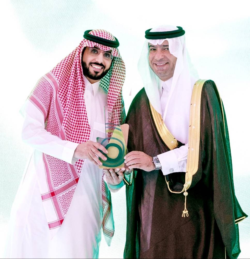 وزير البلديات والإسكان يتوج الزميل العواد جائزة بصمة بلدي. (واس)