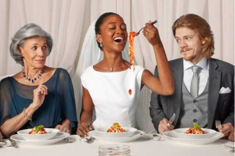 وأضاف: «في هذا الإعلان، المقصد أن تكون العروس على استعداد لسكب صلصة المعكرونة على فستانها خارقة للتقليد، فيما هناك صورة من إعلان آخر تبدو فيه الجدة تأكل الطعام قبل إطعام أحفادها».