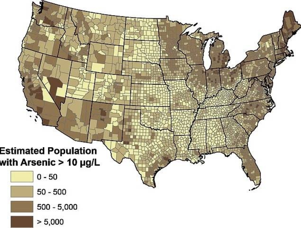 A new map has revealed alarming facts about drinking water in the United States, where millions of Americans are exposed to dangerous levels of arsenic, a naturally occurring element found in soil and rocks that seeps into groundwater over time.