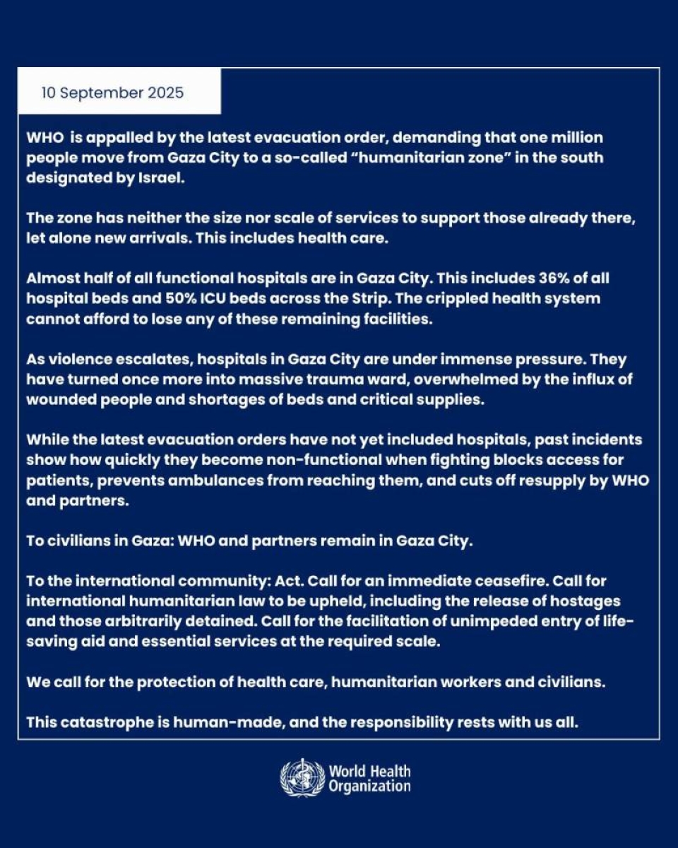 The World Health Organization expressed its shock at the recent evacuation order, which demands the relocation of one million people from Gaza to the humanitarian area in the south, which lacks the capacity or necessary services to accommodate the current population, let alone new arrivals, including healthcare.