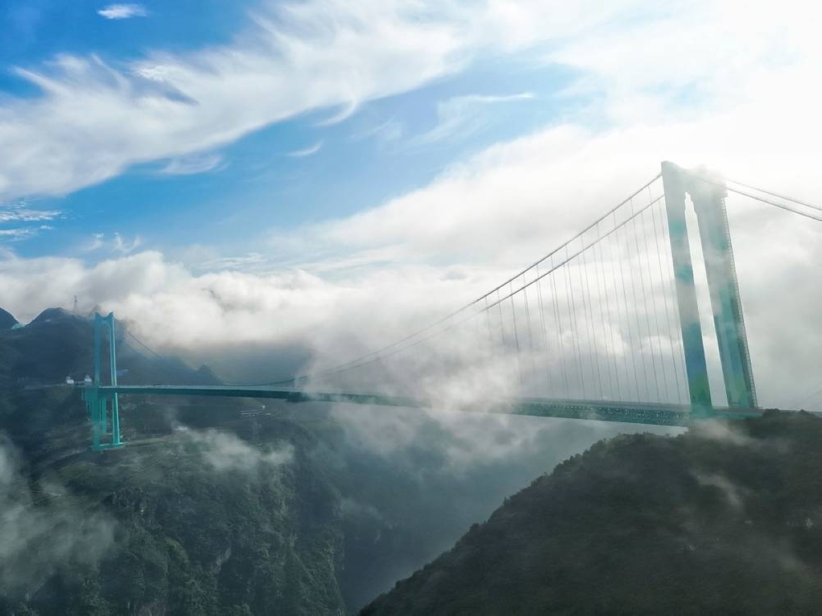 The bridge, which spans a total length of 2,890 meters with a main span of 1,420 meters, carries the Guizhou S57 highway connecting the special regions of Liuzhi and Anlong, is an engineering achievement that surpasses the previous record-holding bridge, the Beipanjiang Bridge, which stands at 565.4 meters and is located just about 100 kilometers away.
