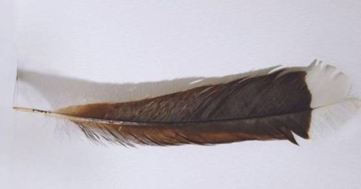 The feather is characterized by its distinctive colors, combining dark brown with white tips at the edges, making it a symbol of prestige and beauty in Māori culture. With the extinction of the bird, these feathers have become exceptionally valuable, both for their historical significance and their rarity.