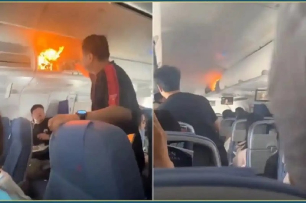 Flames were seen rising from an overhead storage compartment, as shown in a photo taken by a passenger and published by Jiemu News, a state-linked media outlet.