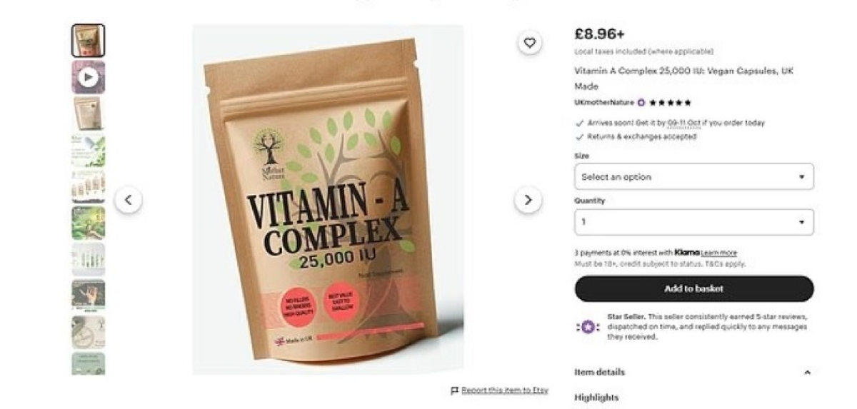 وفيما يتعلق بفيتامين A، وجدت مكملات على «Etsy» «وتيك توك» «شوب» و «إيباي» تحتوي على 7500 ميكروغرام، أي 5 أضعاف الحد الآمن (1500 ميكروغرام)، مما يهدد بالتسمم.