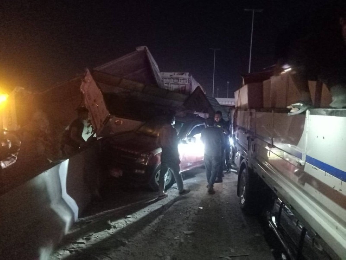 The Suez Road witnessed a horrific collision between 3 trucks, 5 private cars, and 2 buses, resulting in a number of casualties that are currently being counted, in addition to the presence of injured individuals.