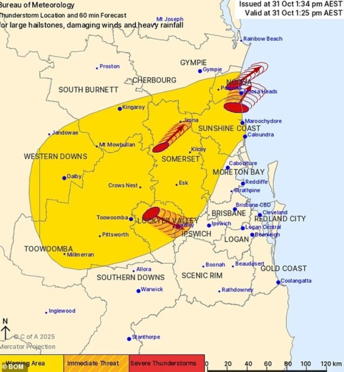 وصدرت تحذيرات عواصف رعدية لمناطق إيبسويتش، سومرست، وادي لوكيير، وساحل الشمس في كوينزلاند لنهاية الأسبوع، مع تركيز التحذير الأشد على أجزاء من وايد باي وبيرنيت، دارلينغ داونز، غرانيت بيلت، وساحل الجنوب الشرقي.