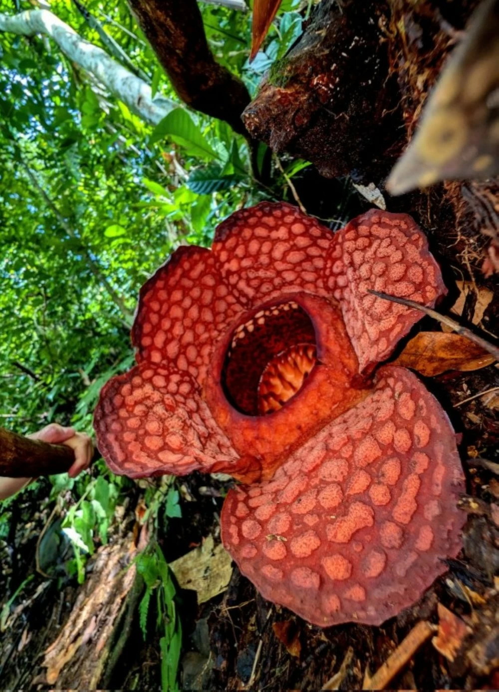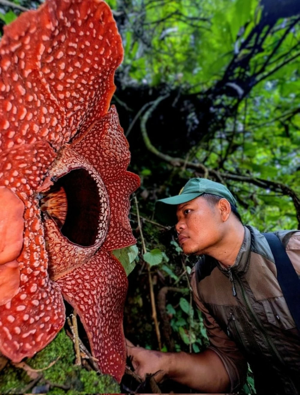 Its foul odor, reminiscent of rotting flesh, attracts pollinating insects, but its short life cycle makes it vulnerable to extinction, with its main threats attributed to deforestation for palm oil cultivation, climate change, and illegal hunting, which threatens 80% of Rafflesia species globally, according to the International Union for Conservation of Nature.