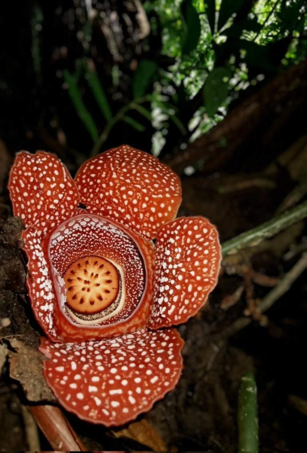 The "Rafflesia hasseltii," locally known as the "corpse flower" or "tiger face fungus," is a unique parasitic species belonging to the genus Rafflesia, which includes about 42 species, most of which are endangered. This flower lacks roots, leaves, or stems; it lives as a fibrous mass inside a host vine in the depths of the rainforest, only appearing to bloom for 5-7 days before it dies.