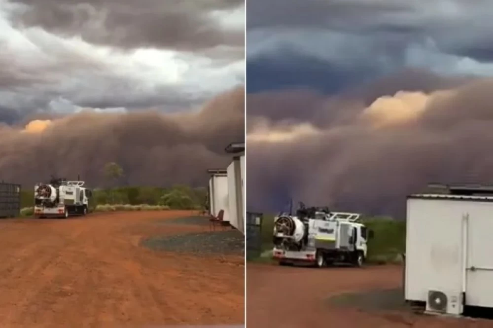 The remote Tanami Desert in the Northern Territory of Australia witnessed an extraordinary weather event, as a massive dust storm surged towards it, covering the sky in a dark copper hue, in an unusual scene captured by workers at a mining site who found themselves facing a huge wall of dust approaching ominously.