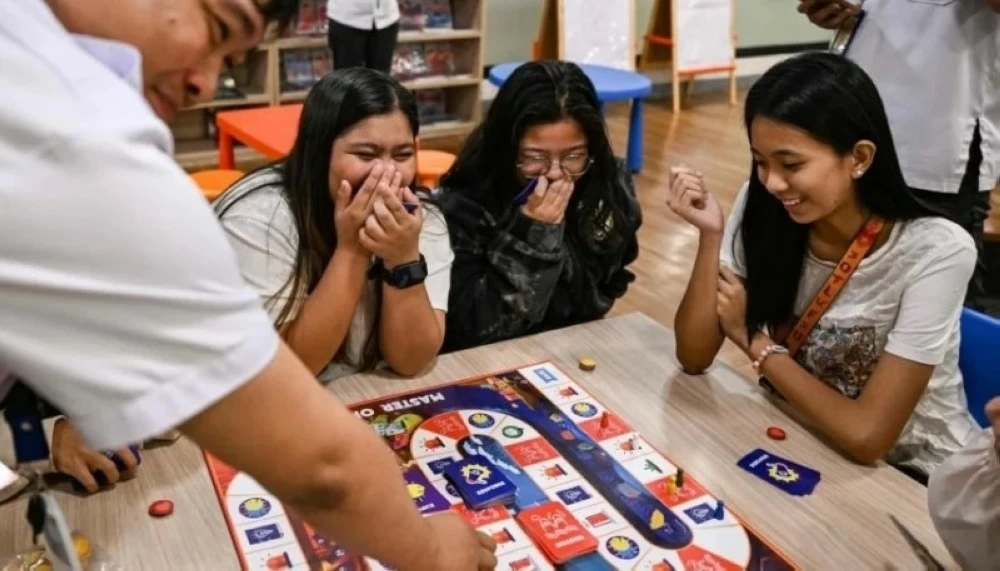 In the Valenzuela Library north of Manila, the atmosphere of play is filled with enthusiasm and cooperation, as players move across the game board by rolling dice, executing instructions from cards that include survival strategies, and earning heroic tokens for rescuing their teammates, in a blend of fun and realistic training.