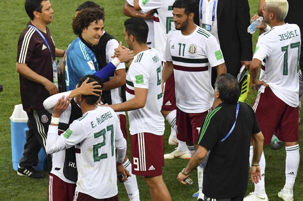 لاعبو المنتخب المكسيكي يتبادلون التهاني بعد الفوز على كوريا الجنوبية.